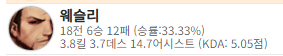 똑같이 막픽 꼴픽 ( 위에 말했듯 6승12패 웨슬리 ) 그래도 원래 웨슬리 유저나 원딜유저가 했으면 모르겠는데